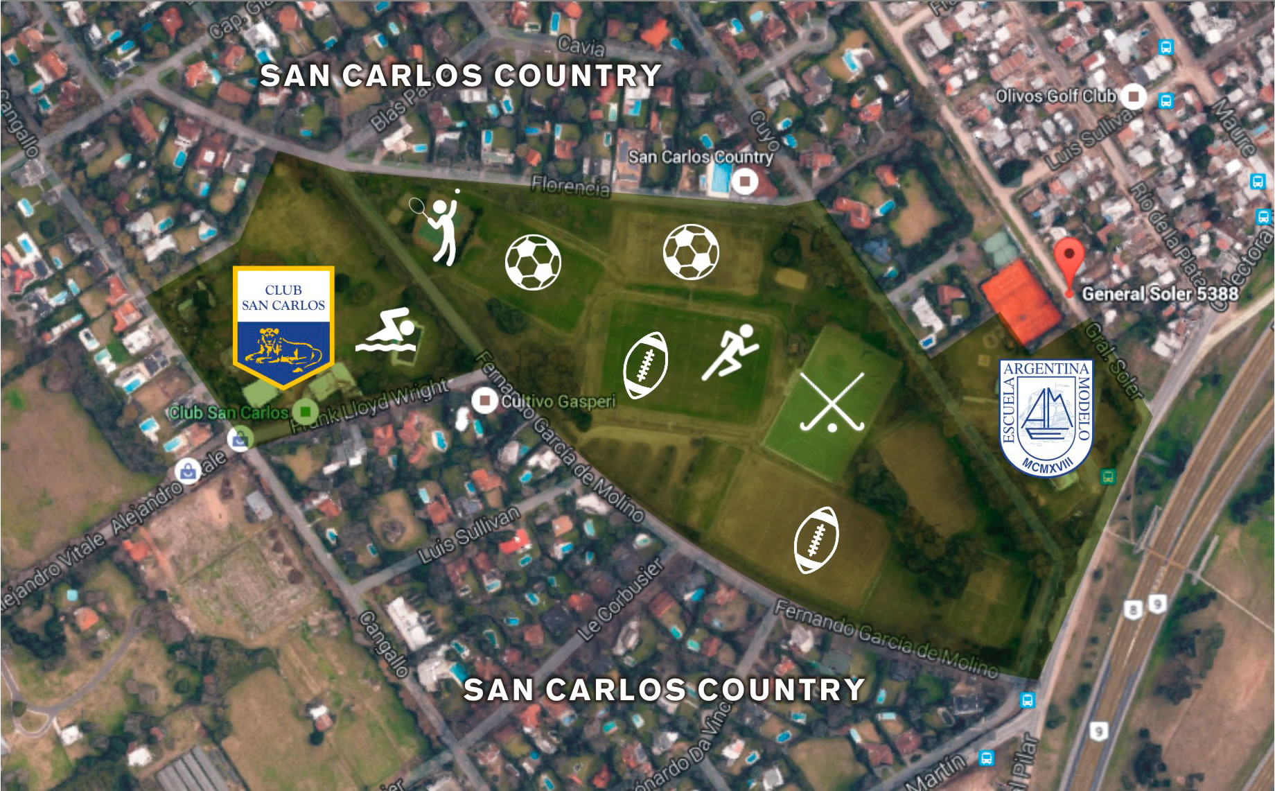 • Canchas de rugby, hockey, fútbol, handbol, softball, voley, pista de atletismo, pileta de natación.