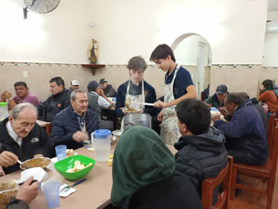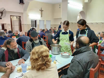 Se concurre durante todo el año, una vez por semana, con los alumnos voluntarios de 4º año. Se sirve la mesa en dos turnos para asistentes más carenciados. También se lavan, secan y guardan los utensilios para los voluntarios del día siguiente. En esta actividad acompañan Directivos y preceptores.