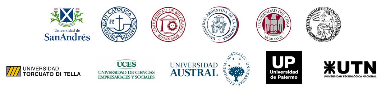 Universidad de San Andrés (UdeSA) - Universidad Argentina de la Empresa (UADE) – Universidad Torcuato Di Tella - Universidad Austral - Universidad de Belgrano (UB) - Universidad Católica Argentina (UCA) - Universidad de Ciencias Empresariales y Sociales (UCES) – Universidad del CEMA (UCEMA) - Universidad de Buenos Aires - Universidad de Palermo (UP) - Universidad Tecnológica Nacional (UTN).